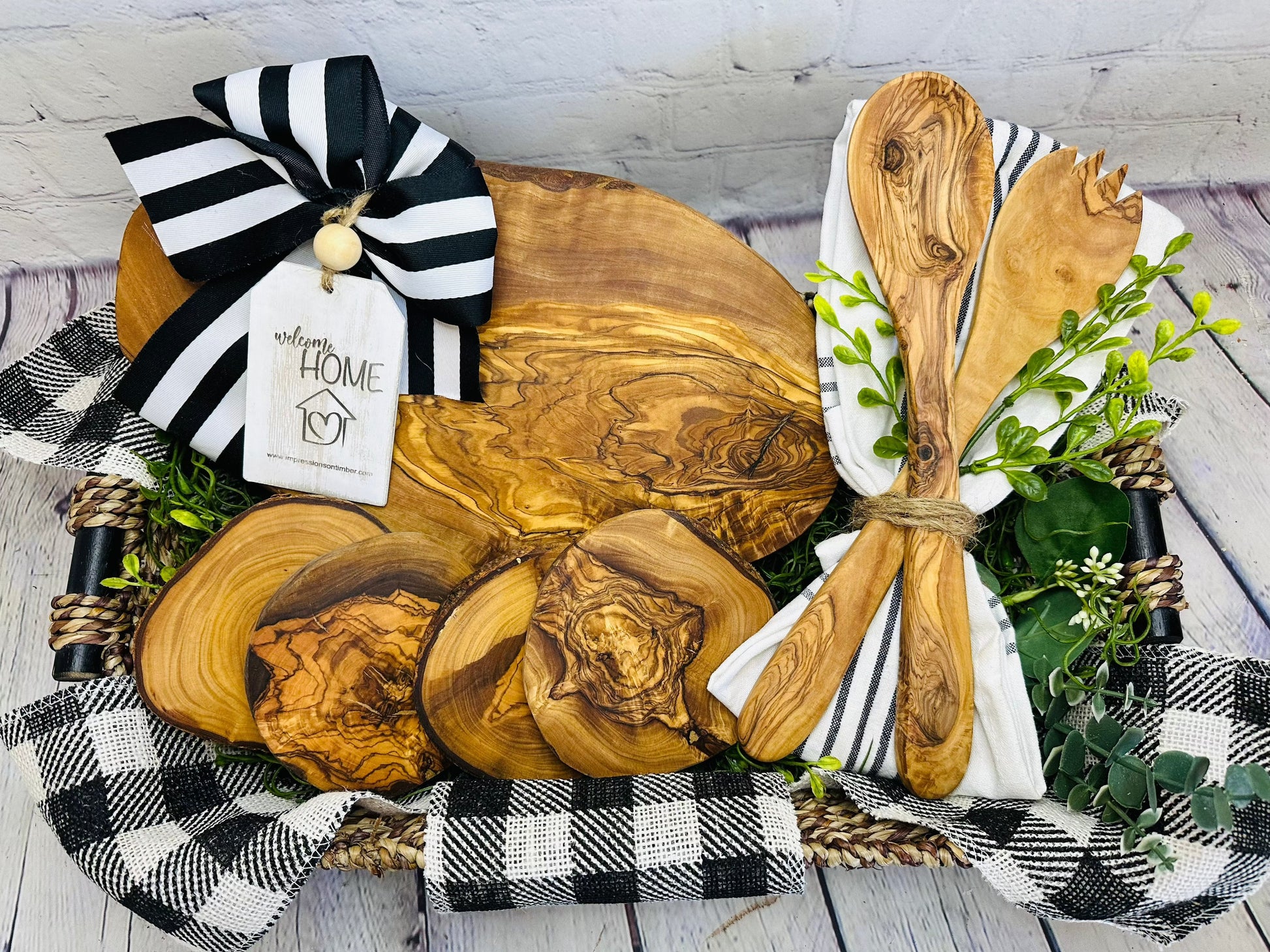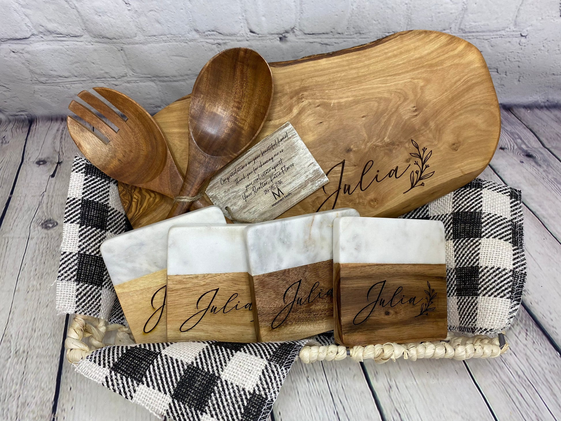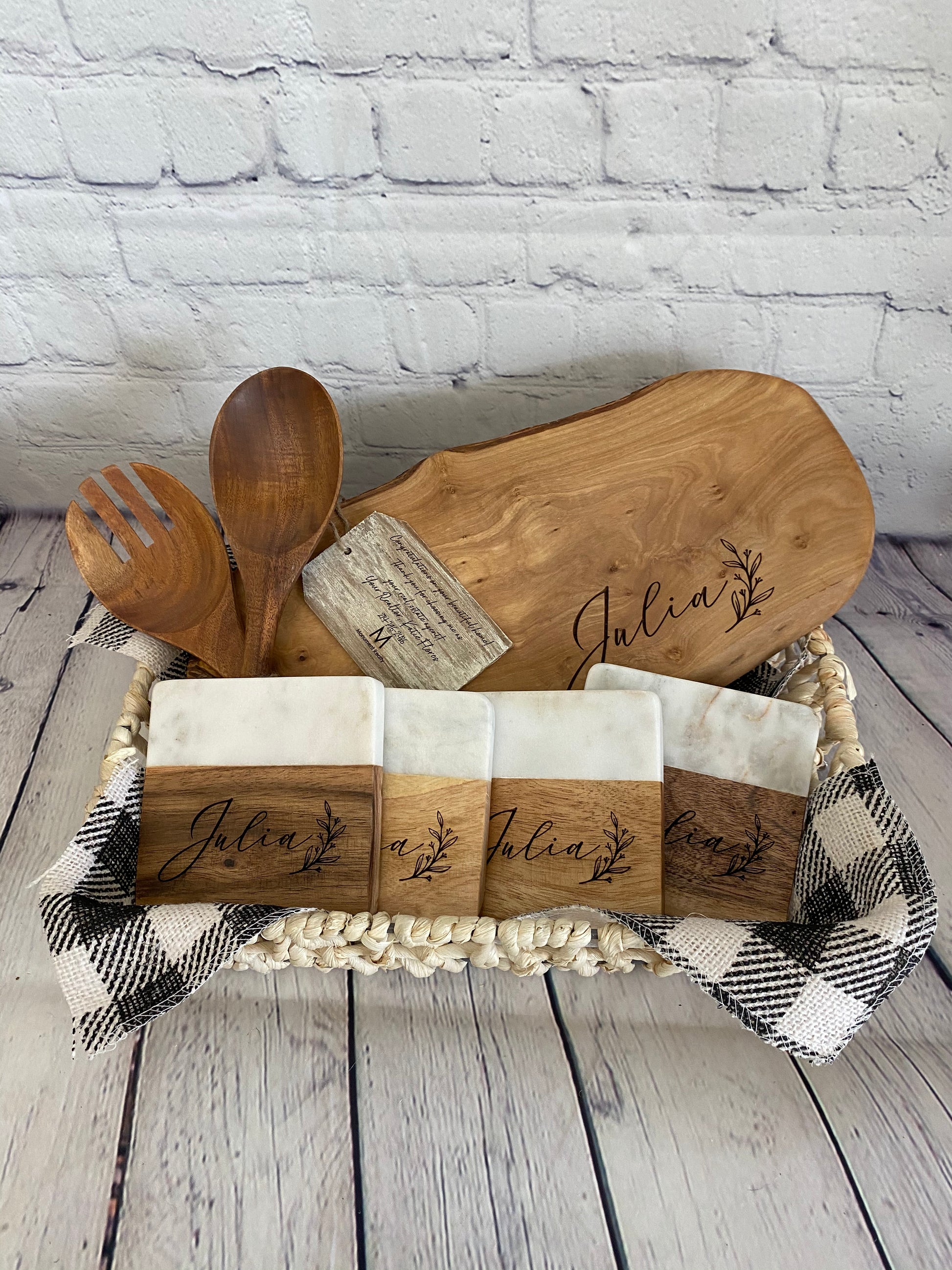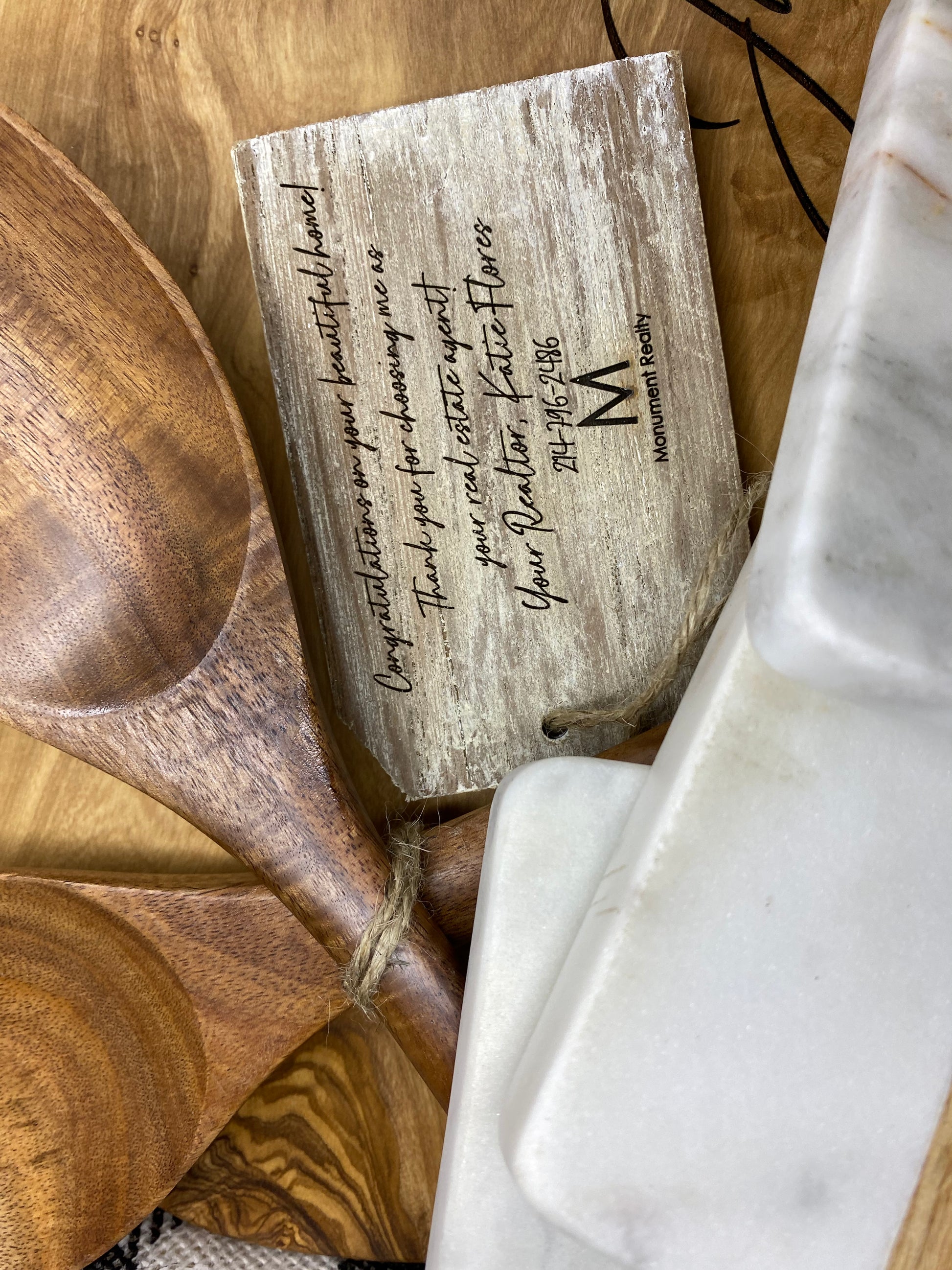 The ultimate basket for the realtor who wants to handpick every product in their client appreciation gift. This basket is the epitome of choice - add the items you want to give, in the material and size you want! This one-of-a-kind gift isn't just something to give, but also stands as an expression of your gratitude and a testament to the strength of your client relationships. Impressions on Timber will handmake each piece to your exact specifications—choose from a variety of designs and fonts or upload your own custom design. The quality of Acacia and Olive Wood ensures that, once engraved, your gift will look simply perfect.